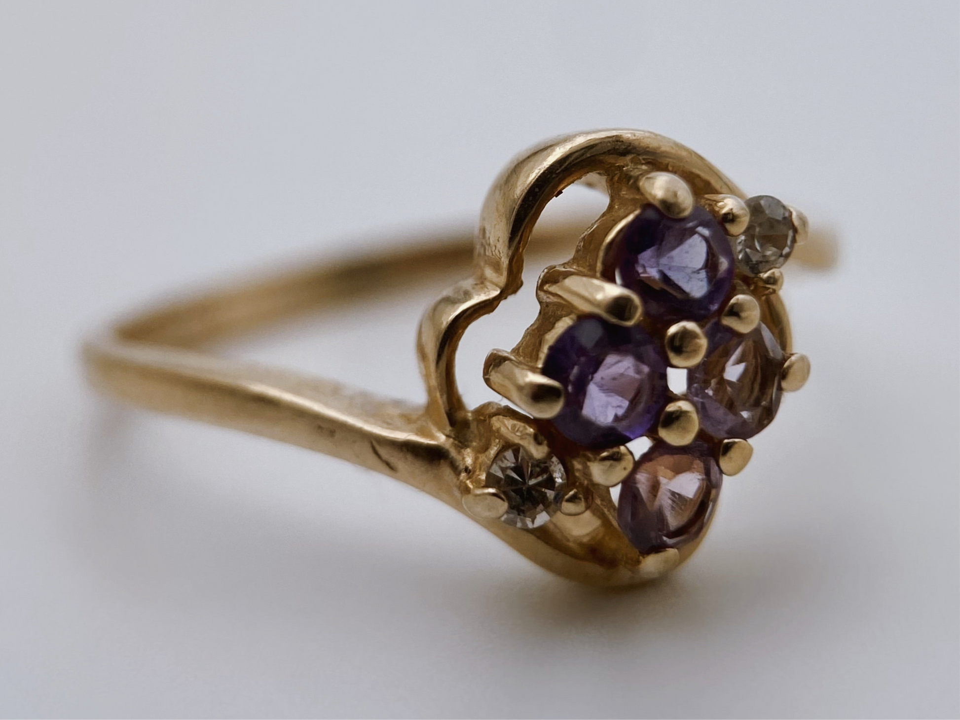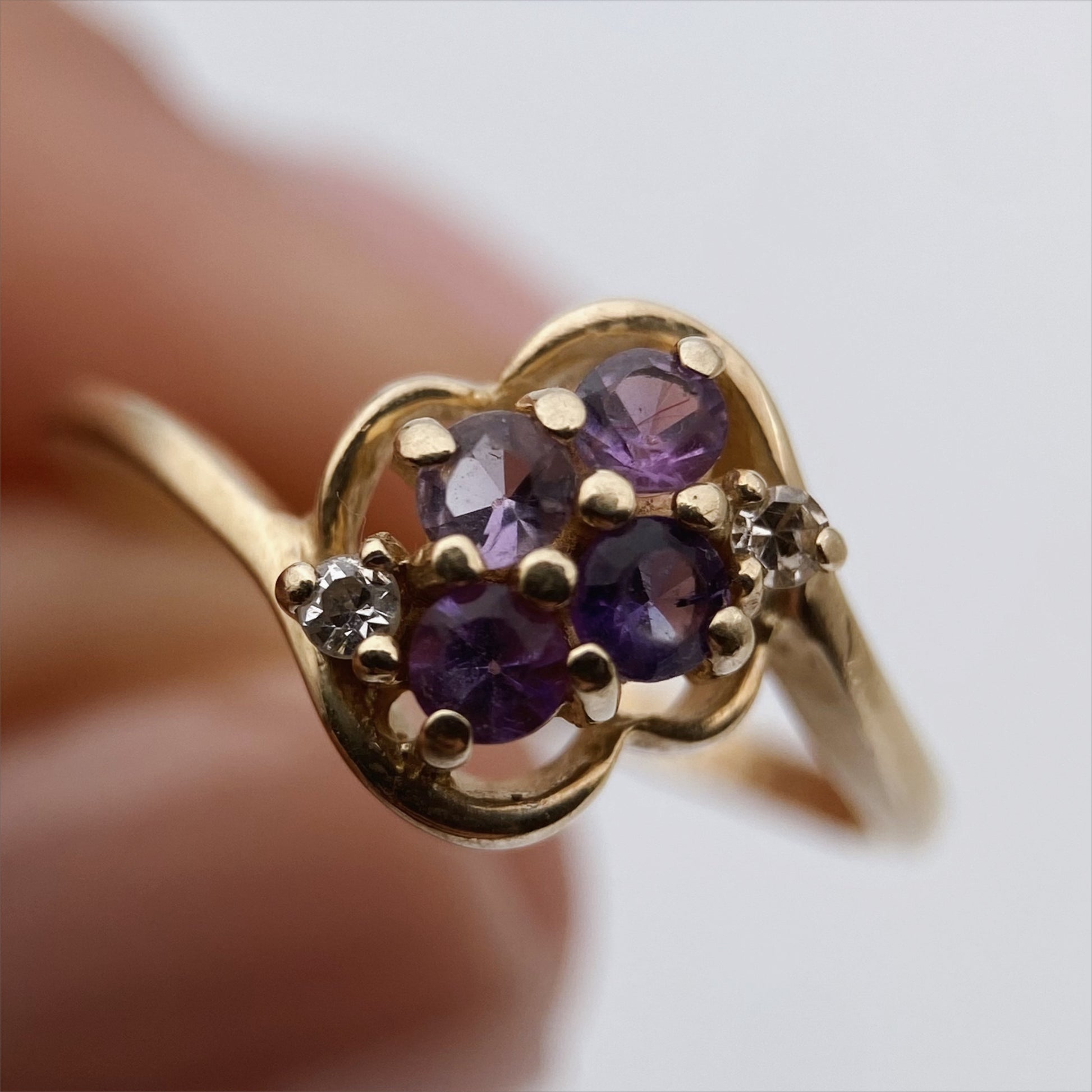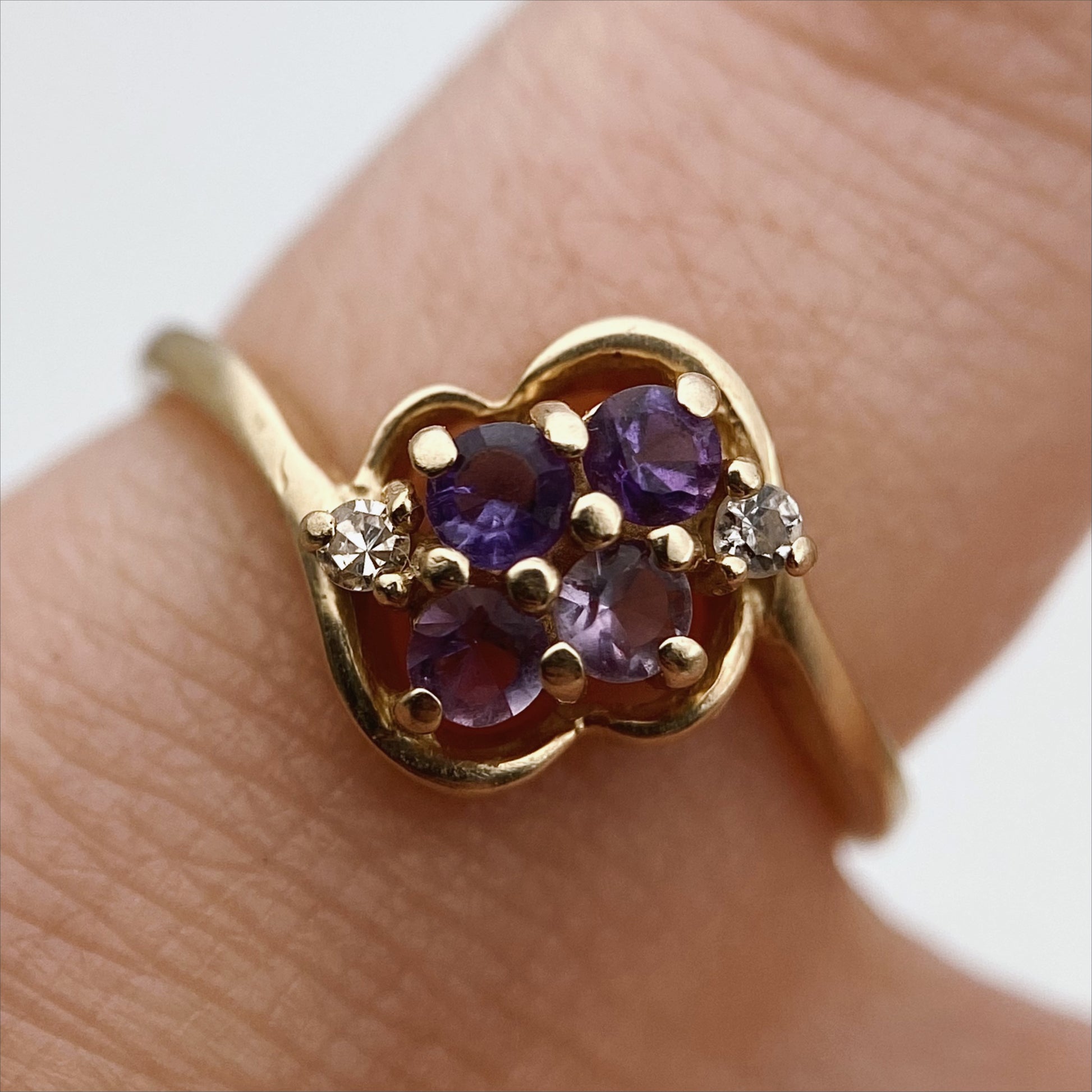 Sudėtis: 14 karatų auksas (58,5% gryno aukso), 4 ametistai, 2 deimantai Būklė: labai gera Vidinės dalies skersmuo: 16 mm Dydis: 5,5 (JAV) Svoris: 2,1 g Spalva: aukso, violetinė, balta Žymėjimas: "14K P"* Šalis: JAV Laikotarpis: 1980-1990 metai Rinkos vertė: 150-300 EUR