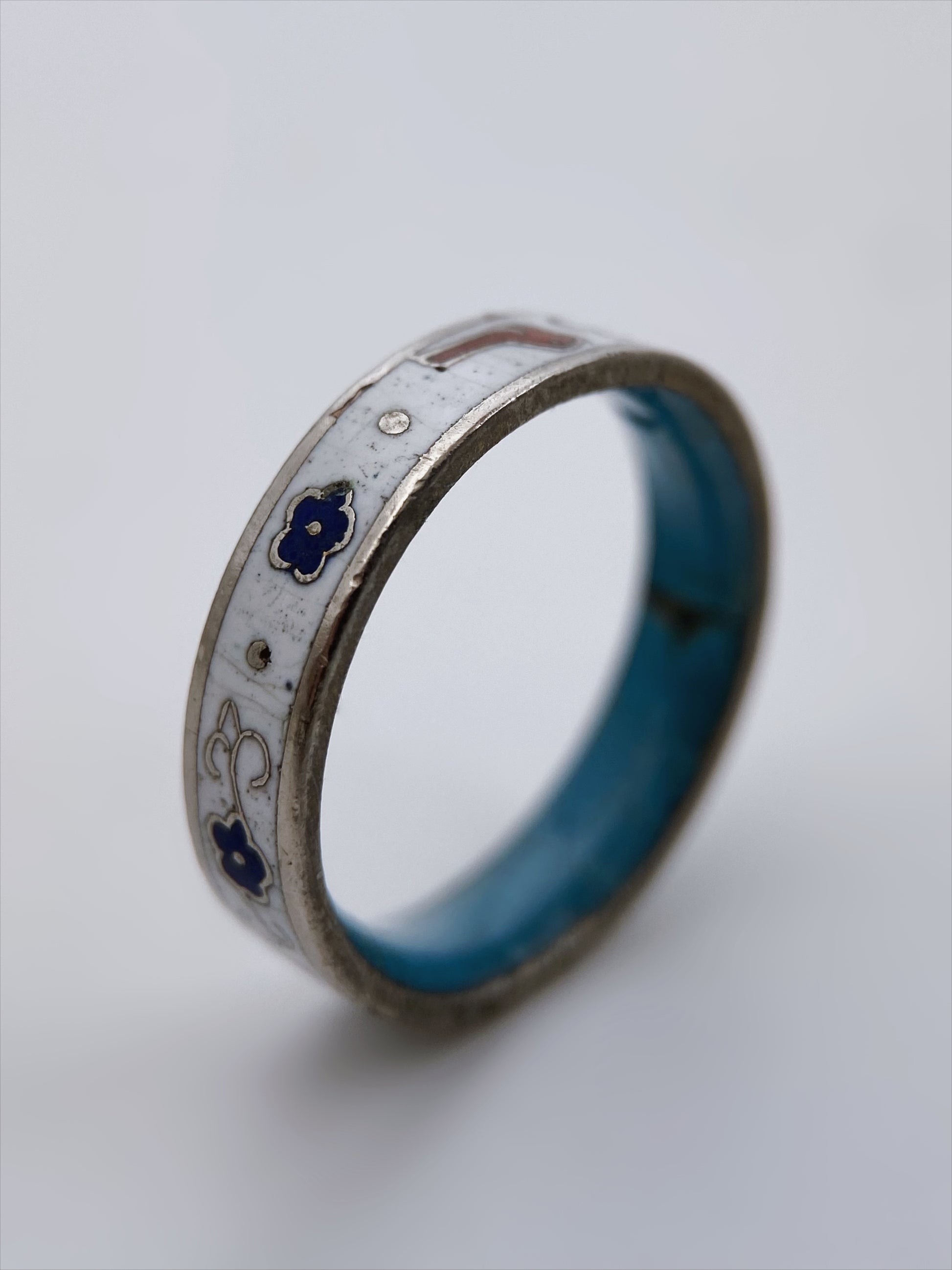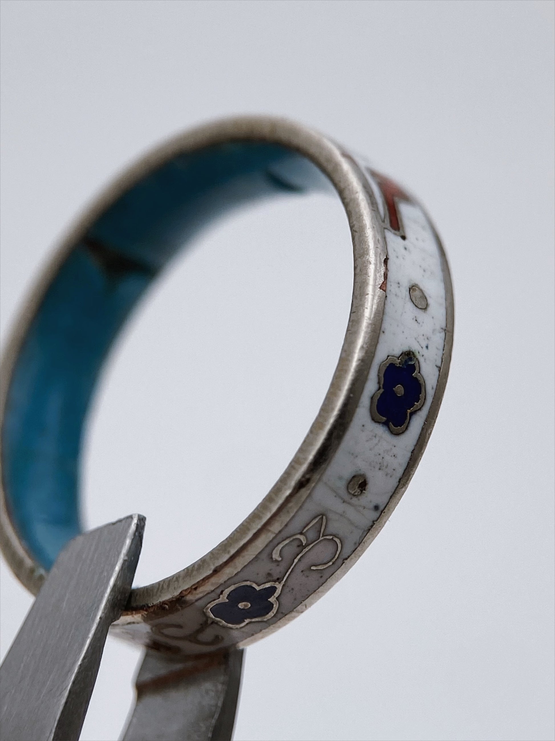 Vintažinis emaliuotas žiedas su rankų darbo ornamentais. Juosta dekoruota spalvotu cloisonné emaliu, vaizduojančiu raudoną paukštelį, baltas gėles ir augalinius motyvus. Žiedo vidinė pusė padengta turkio mėlynumo emaliu, būdingu tibetietiškai ir nepalietiškai juvelyrikos tradicijai. Pagamintas iš sidabro lydinio, žiedas išsiskiria švelnia patina ir meistriška rankų darbo technika. Subtilus rytietiškas dizainas suteikia jam kolekcinę ir meninę vertę, todėl tai puikus pasirinkimas vintažinių papuošalų mėgėjams. Prekės kodas: RF007