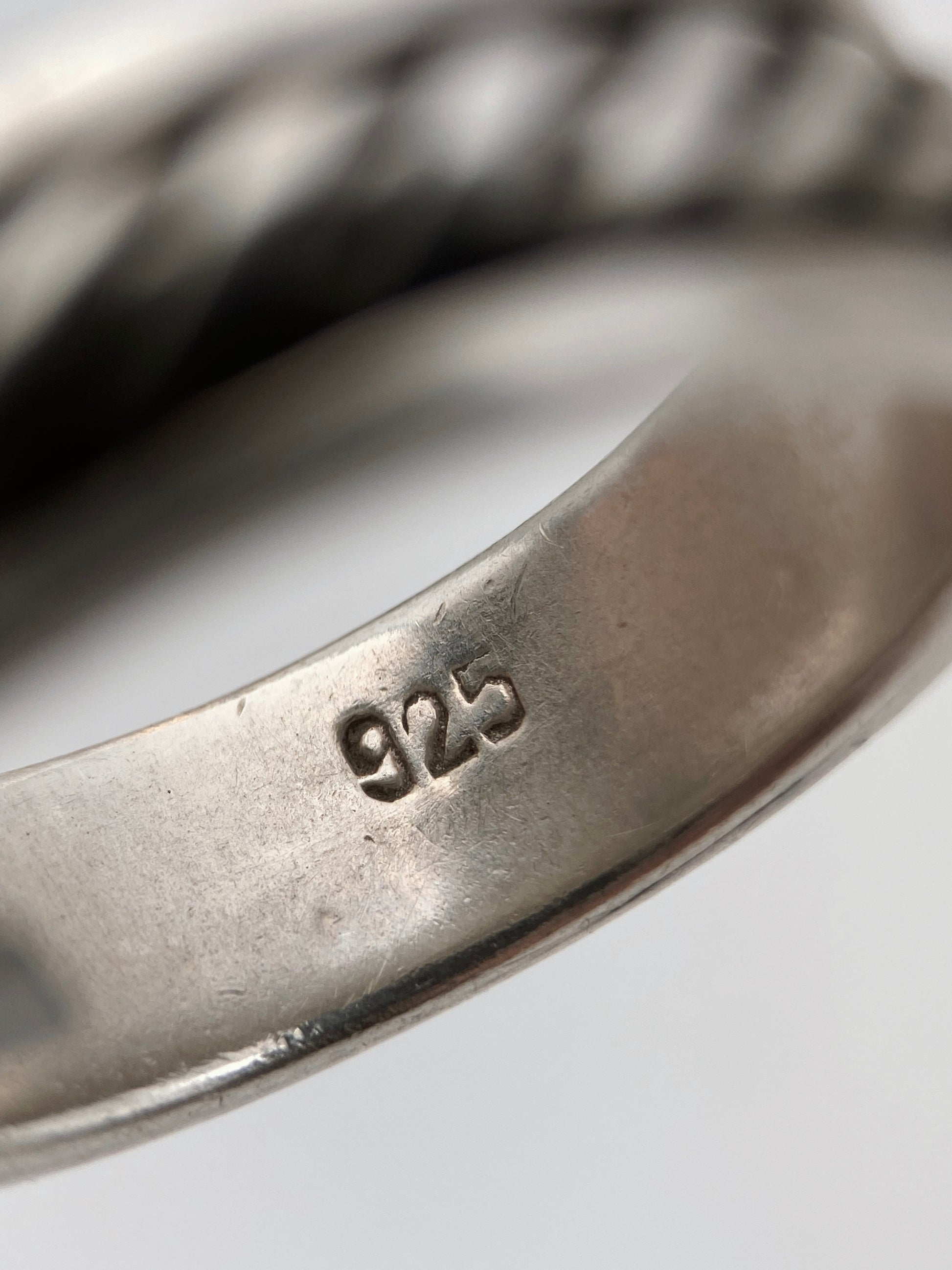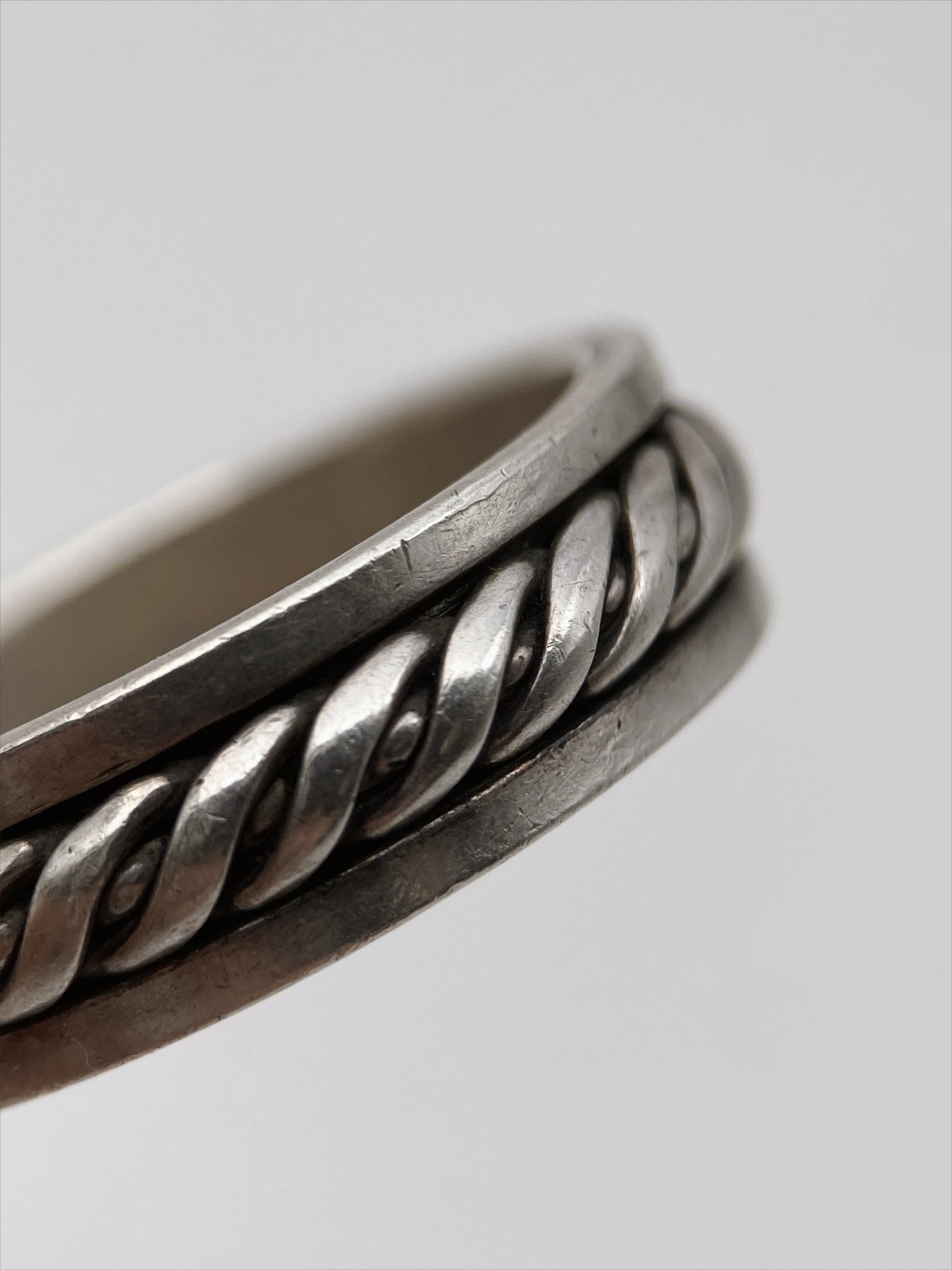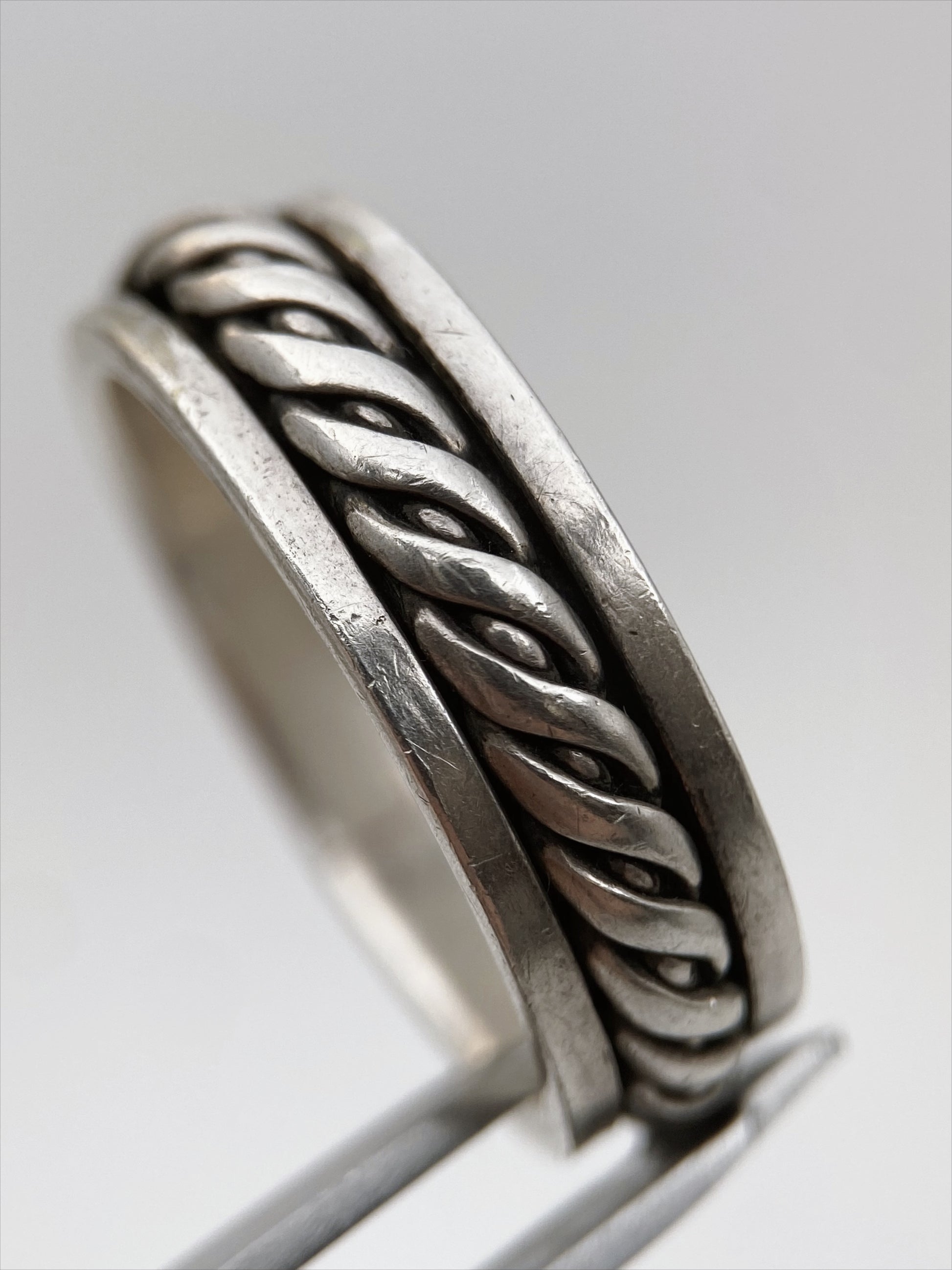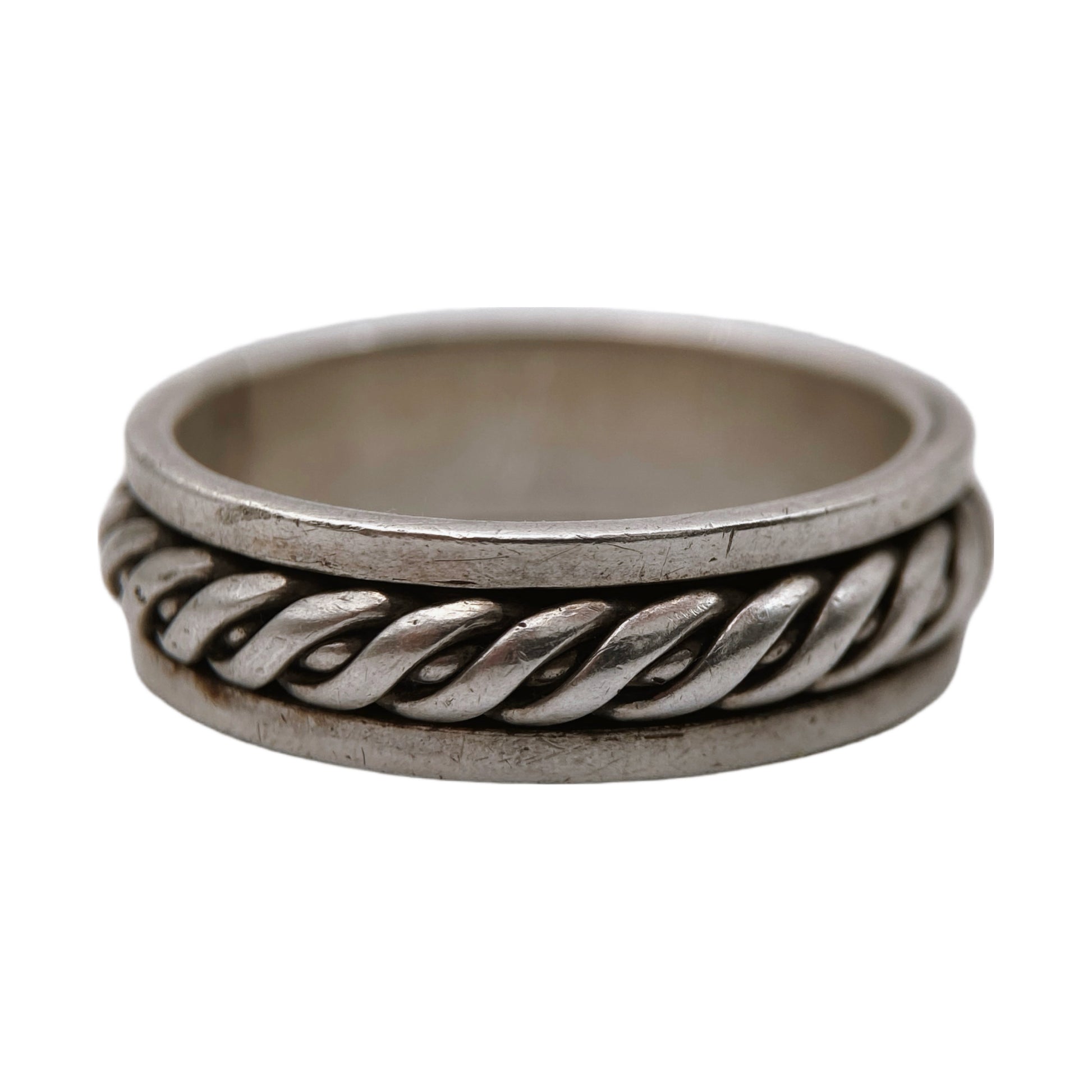 Sidabro žiedas, su klasikine pintos virvės („rope twist“) juosta. Tai dizainas, dažnai naudojamas unisex žieduose. Prekės kodas: RF011