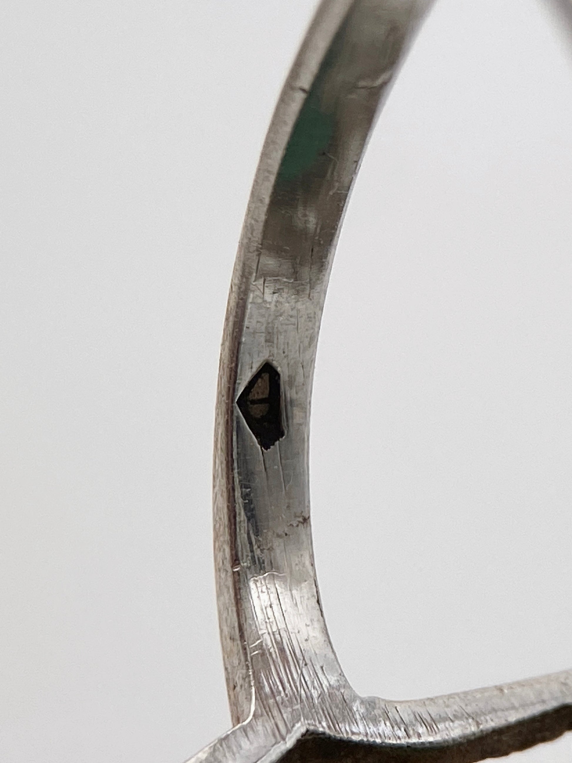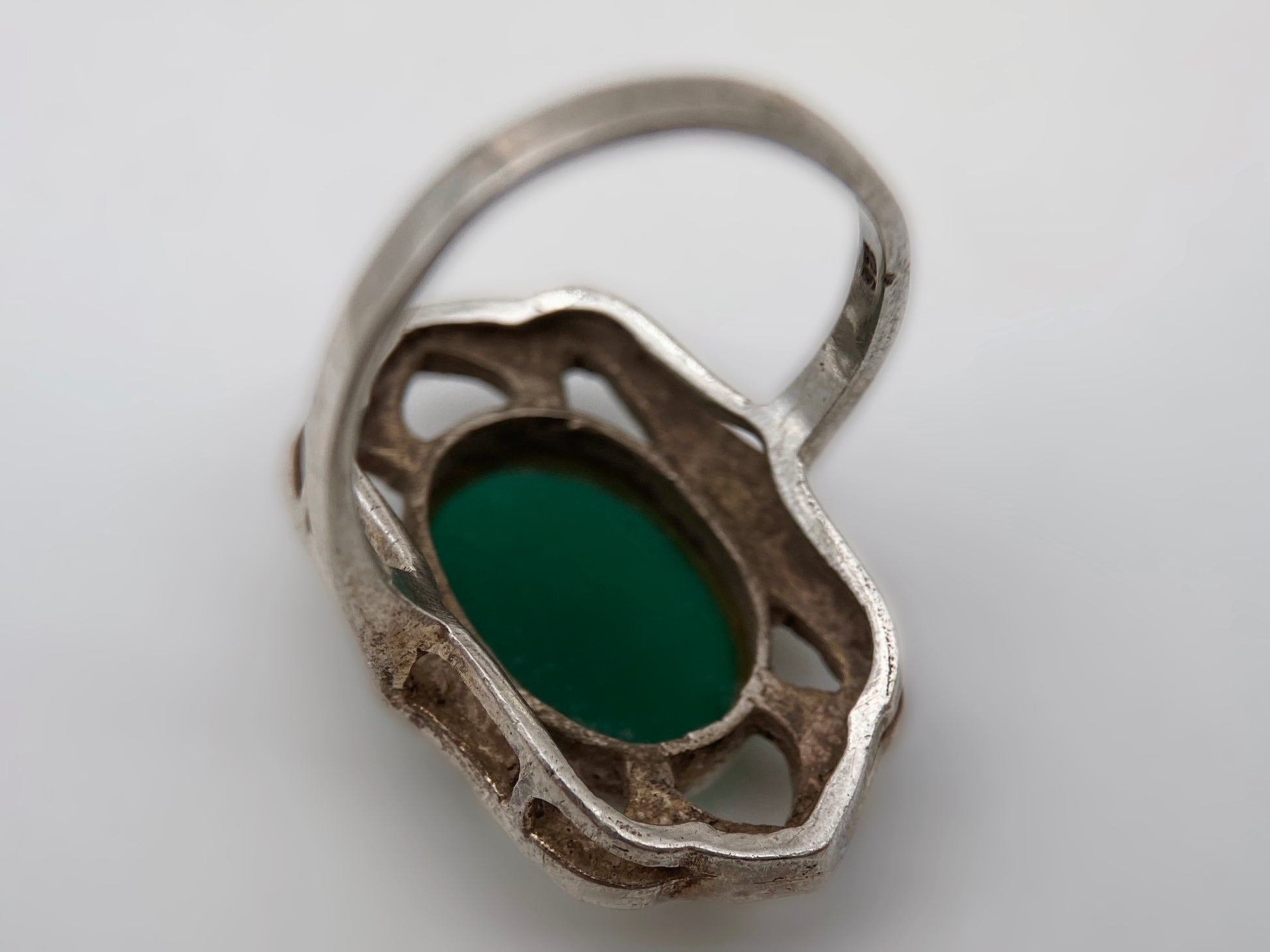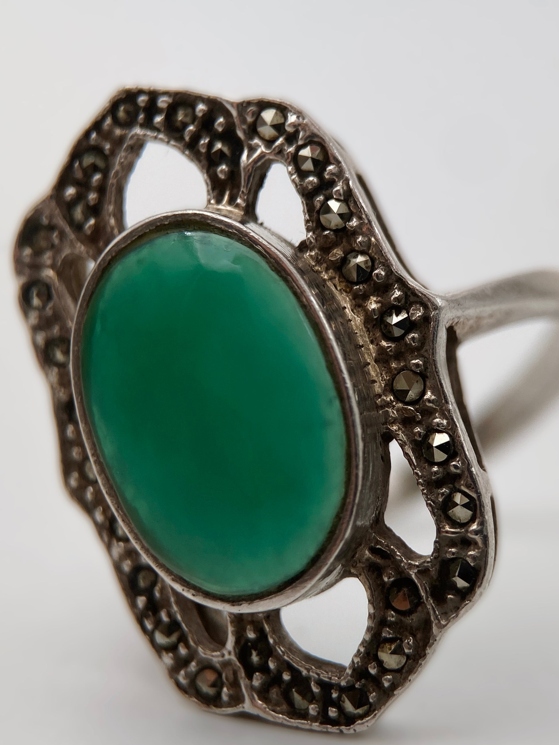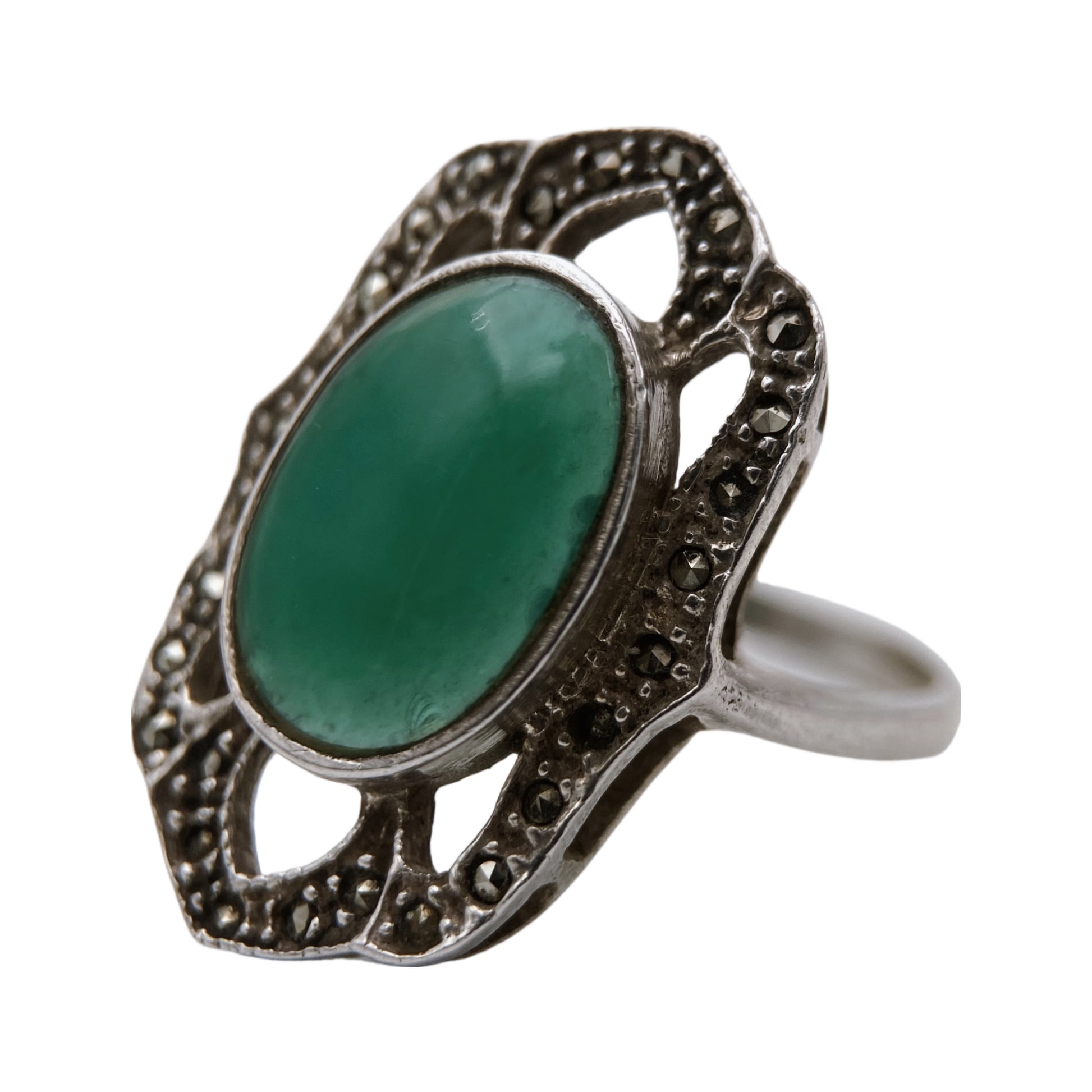 Elegantiškas vintažinis žiedas, pagamintas iš 925 prabos sidabro. Centre – sodriai žalios spalvos akmuo, būdingas Vokietijos ir Austrijos Art Deco tradicijoms. Tai gali būti natūralus žaliasis agatas arba chrizoprazas – abu šie akmenys plačiai naudoti 1930–1950 m. markazitų papuošaluose. Žiedą puošia rankiniu būdu įstatyti senoviniai markazitai, išdėstyti ažūriniame Art Deco laikotarpio ornamente. Konstrukcija masyvi, su tipiška vokiečių gamintojams būdinga išplėsta viršutine plokštuma. Vidinėje juostelėje yra senovinė penkiakampė meistro žyma („namelio“ forma), kurioje matyti dvi raidės, o viena iš jų – lyg L. Tokias žymas naudojo Vokietijos Pforzheimo meistrai 1930–1955 m. Tai patvirtina ir žiedo dizainas, ir markazitų pjūvio technika.
