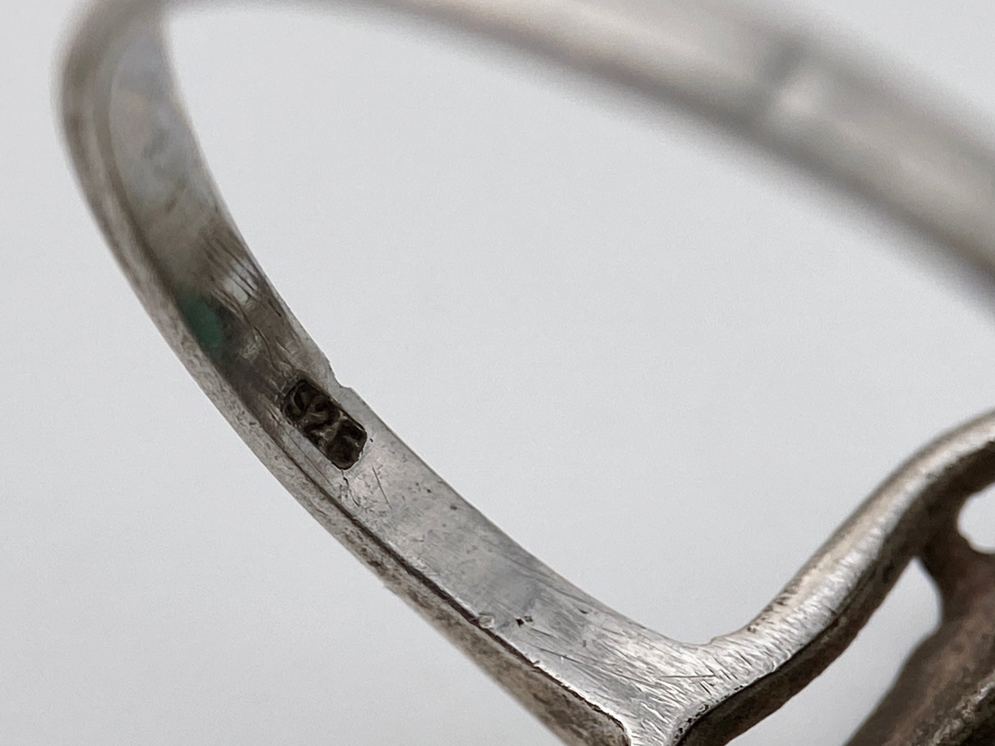 Sudėtis: 925 sidabras, akmuo, markazitai Gamybos būdas: rankų darbas Būklė: labai gera Vidinės dalies skersmuo: 19 mm Spalva: sidabro, žalia Žymėjimas: “925 penkiakampė figūra su meistro inicialais” Šalis: Vokietija Laikotarpis: 1930-1950 metai Rinkos vertė: 100-150 EUR