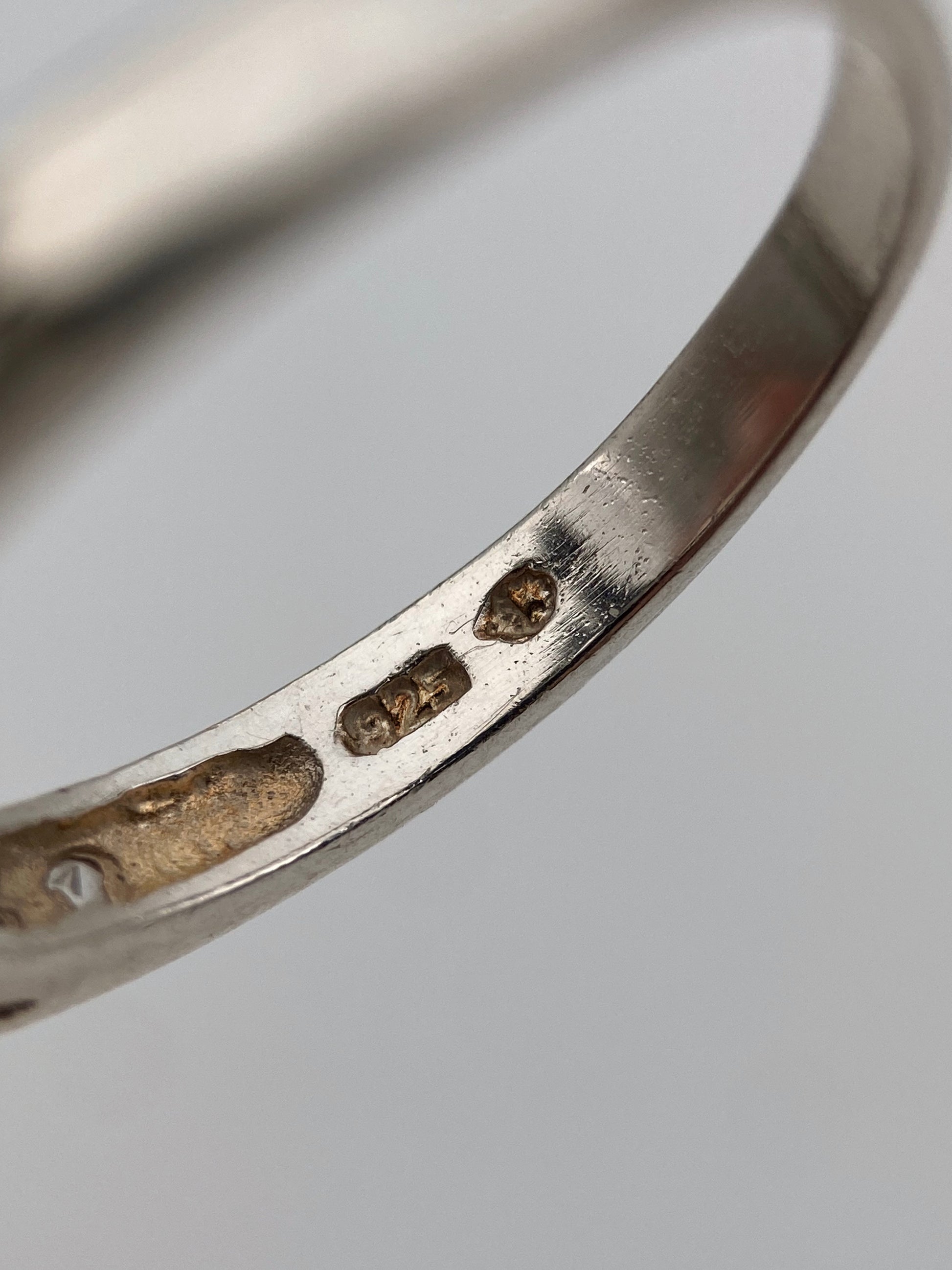 Sudėtis: sidabras, tikėtina spinelis, cirkoniai Būklė: labai gera Vidinės dalies skersmuo: 21 mm Spalva: sidabro, juoda Žymėjimas: “925, simbolis” Šalis: Jungtinė Karalystė Laikotarpis: 1990-2000 metai Rinkos vertė: 50-70 EUR