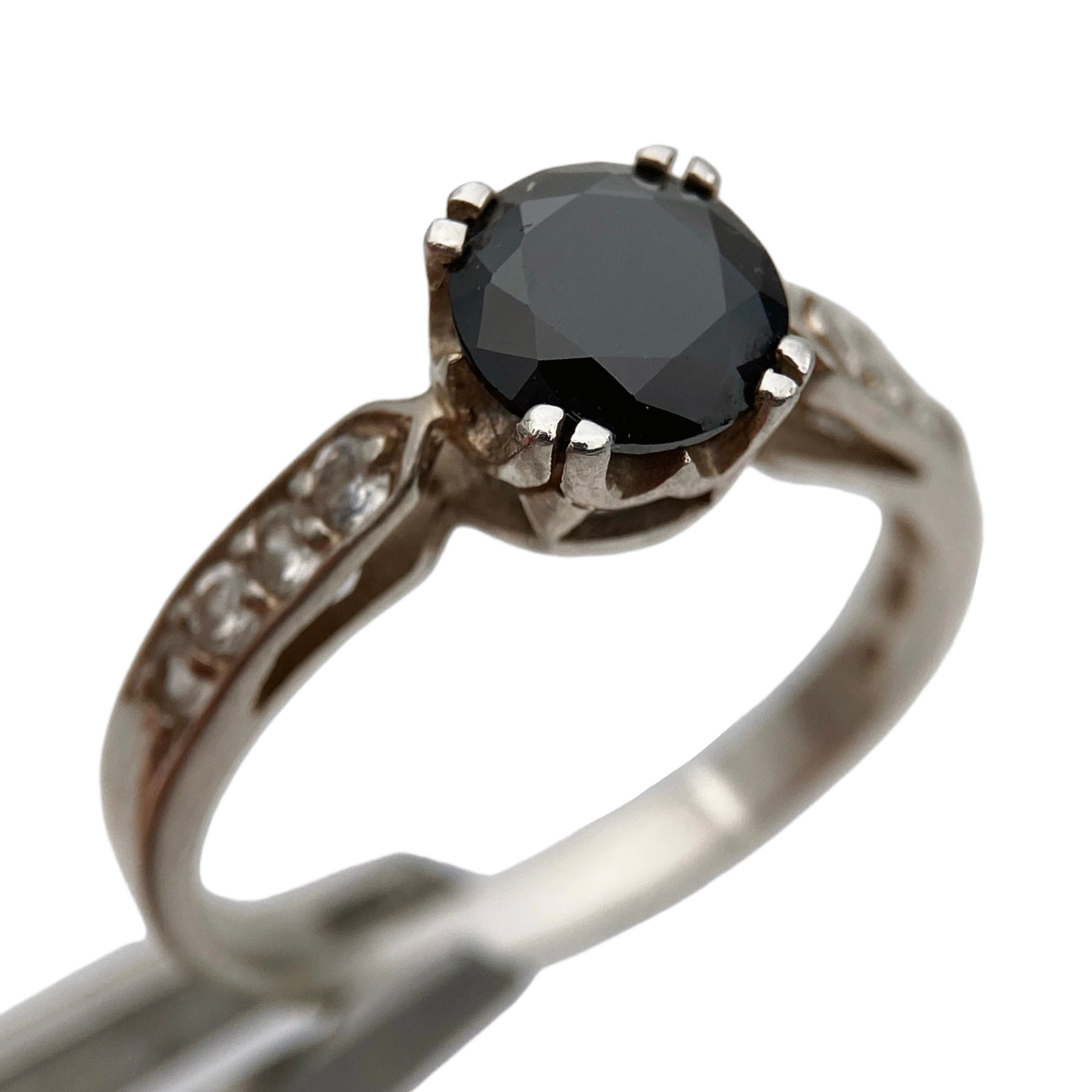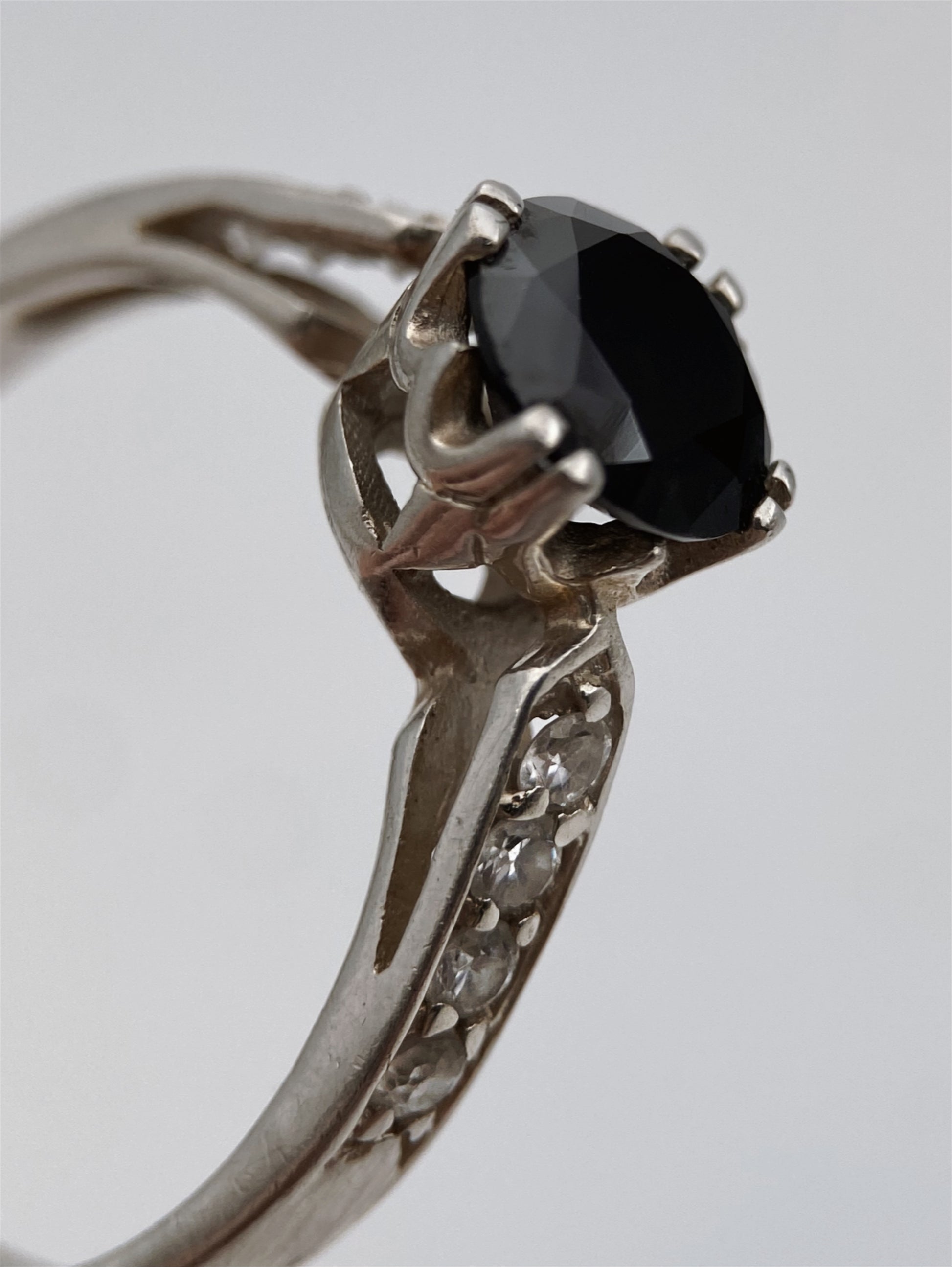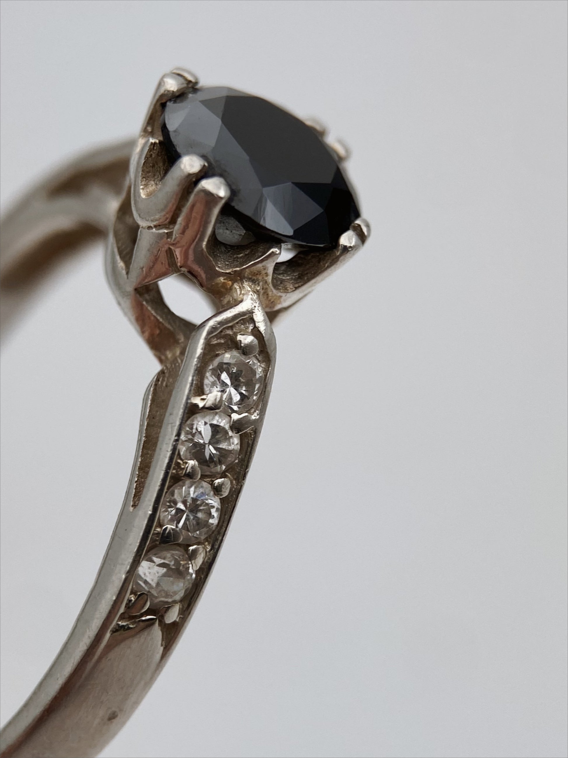 Elegantiškas sidabro žiedas su juodu centrinio akmens akcentu. Akmuo – ovalo formos, briaunuotas, įtvirtintas keturiais laikiliais, o abiejuose šonuose išdėstyti maži skaidrūs akmenukai. Vidinėje žiedo dalyje matomas aiškus 925 ženklinims bei simbolis, kuris atrodo kaip gyvūno galva. Prekės kodas: RF014
