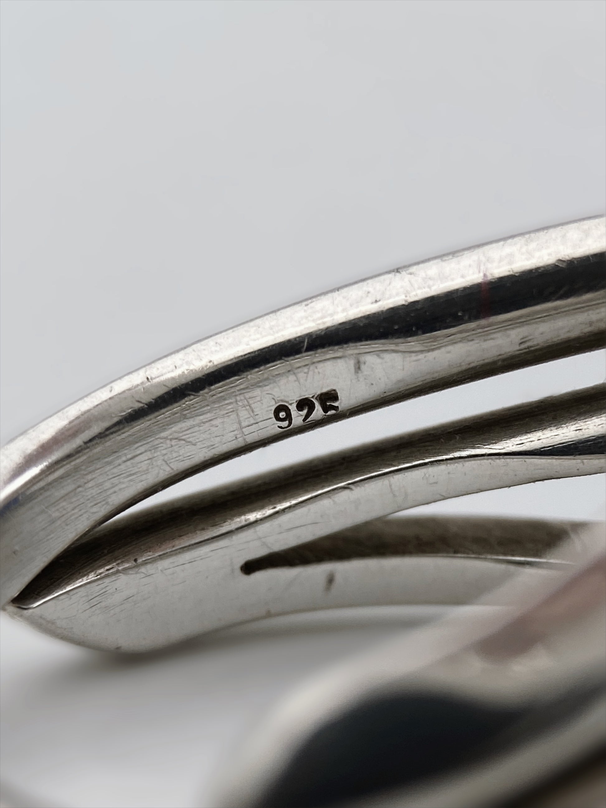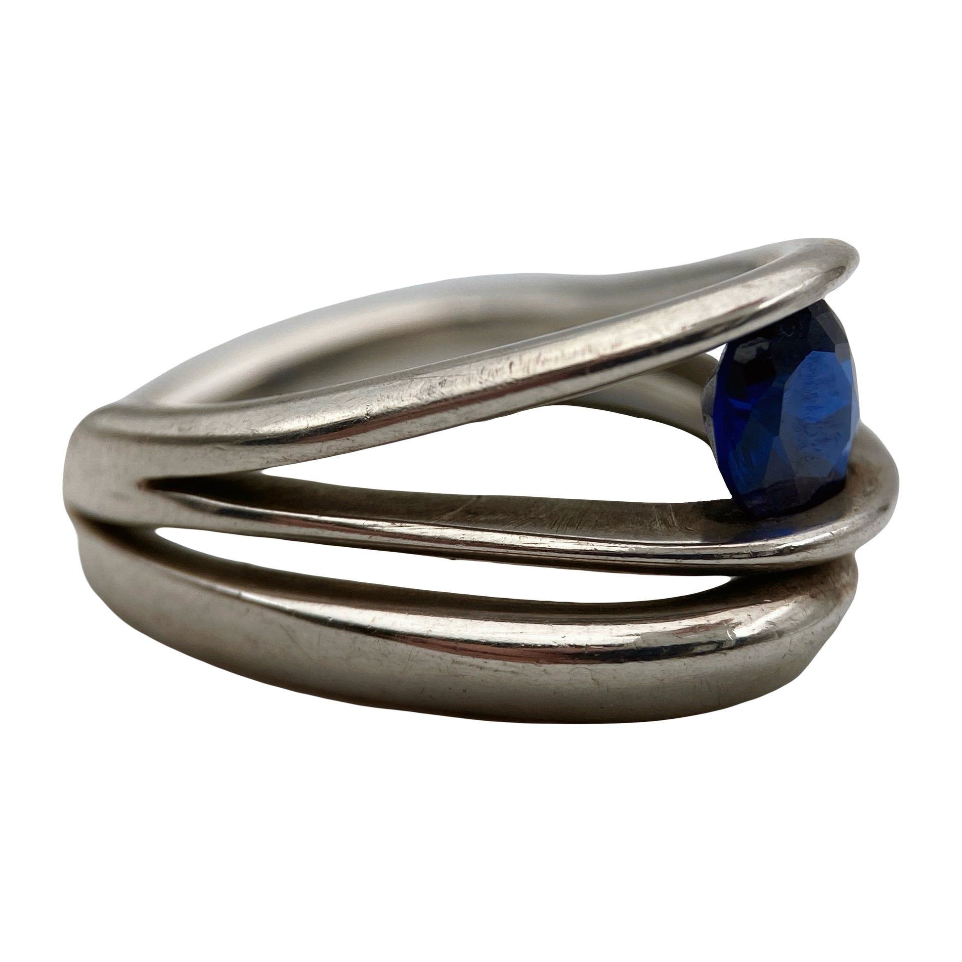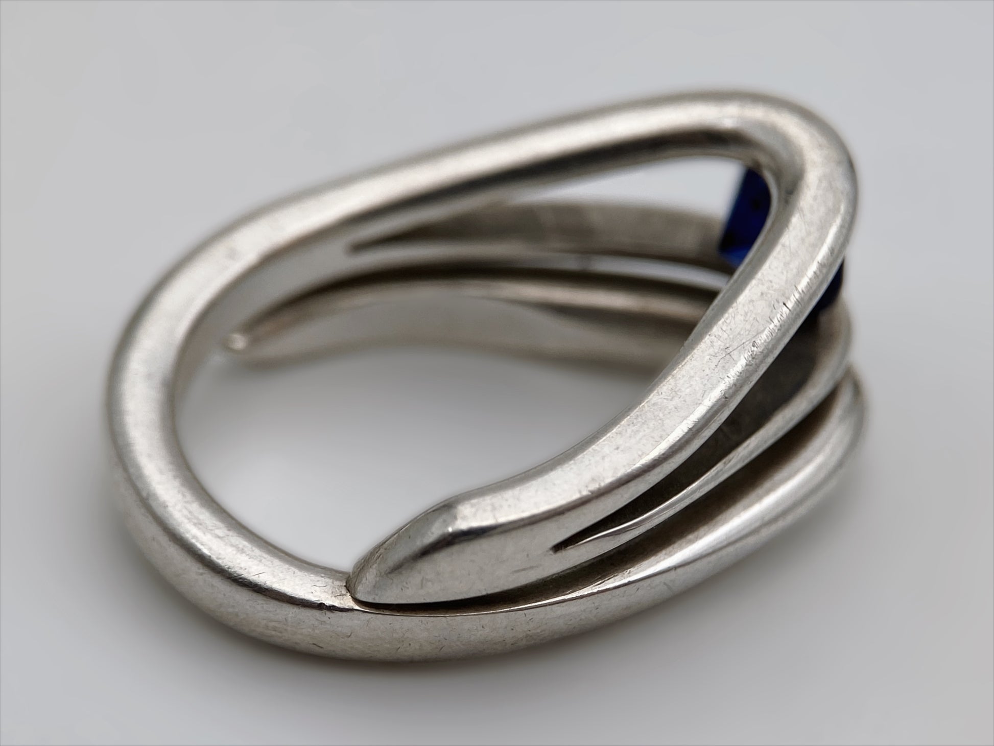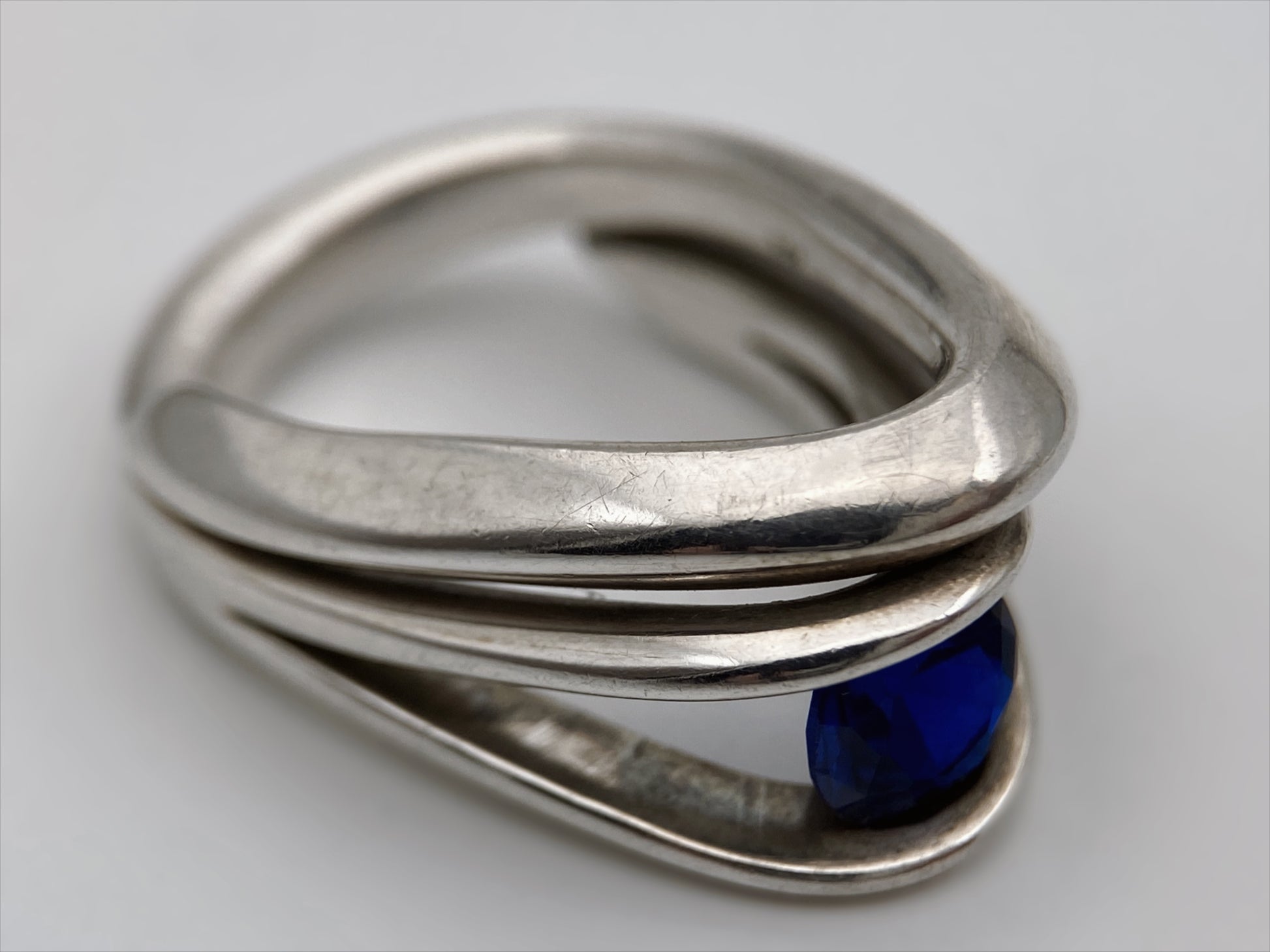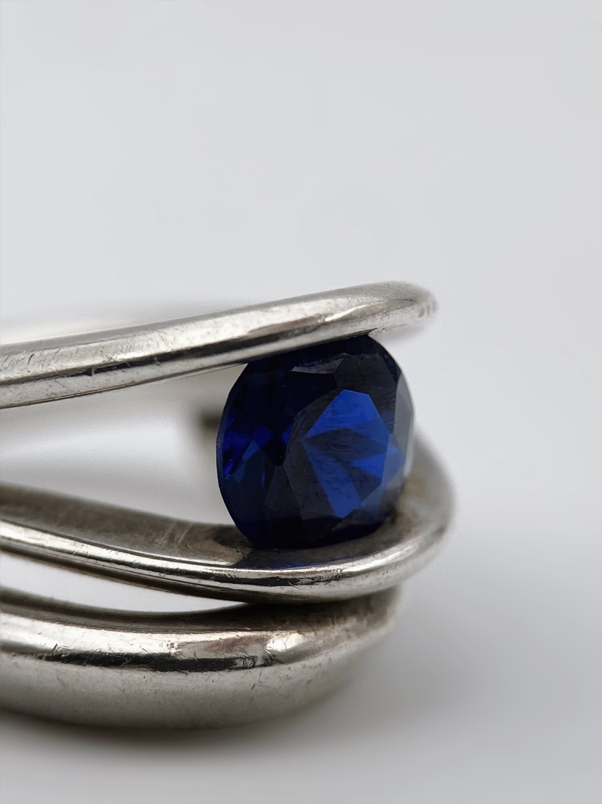 Sudėtis: sidabras, stiklo kristalas (sintetinis safyras) Būklė: labai gera Vidinės dalies skersmuo: mm Spalva: sidabro, mėlyna Žymėjimas: “925” Šalis: Vokietija Laikotarpis: 1970-1990 metai Rinkos vertė: 45-55 EUR Tai modernistinio stiliaus 925 prabos sidabro žiedas su sintetiniu mėlynu safyro tipo kristalu. Dizainas pasižymi abstrakčia, skulptūriška forma – sidabro juostos sujungtos į asimetrišką kilpą, kuri subtiliai apgaubia akmenį. Mėlynas briaunuotas akmuo pagyvina dizainą, suteikia jam gylio ir kontrasto. Prekės kodas: RF015