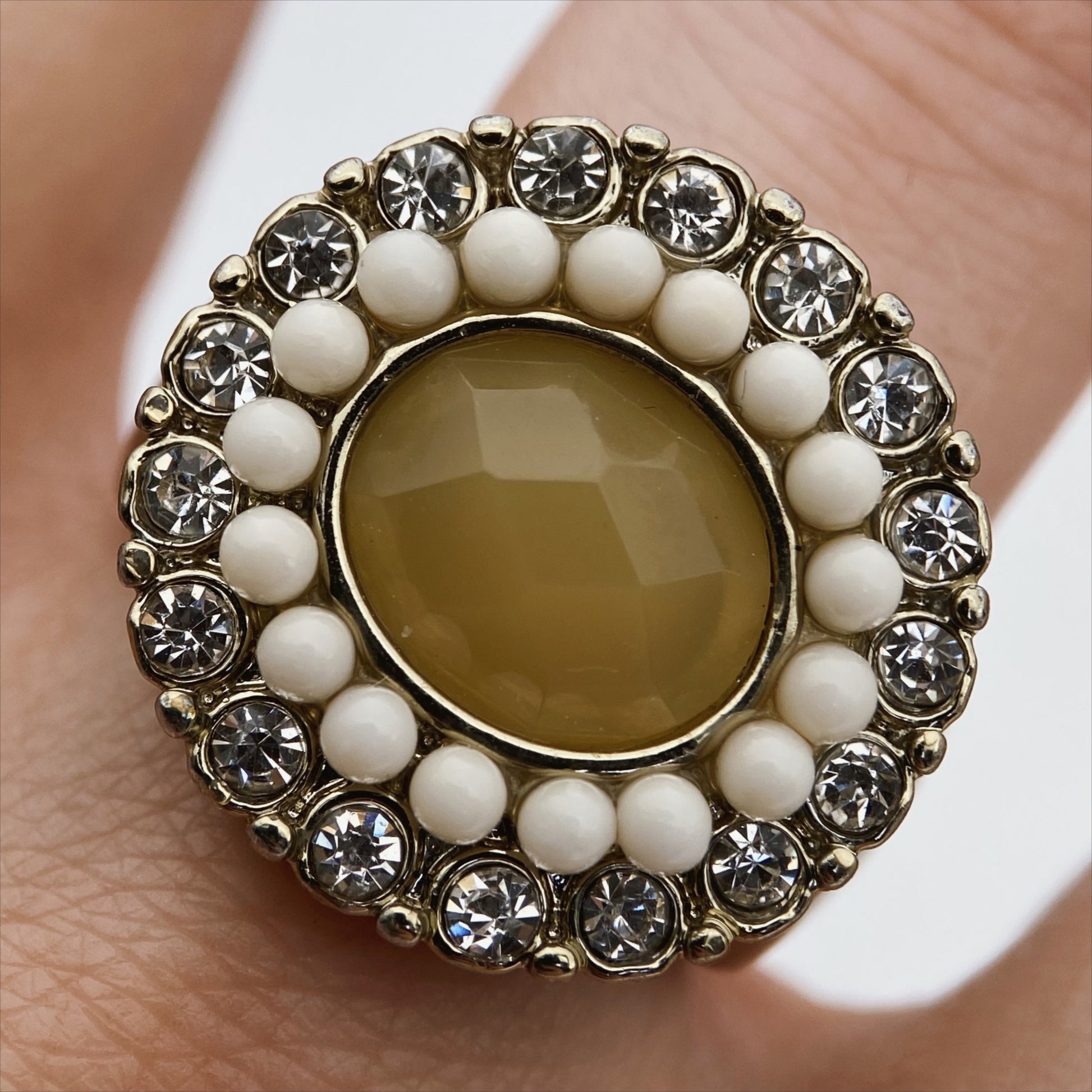 Žyma „BR“ – tai Banana Republic, amerikiečių drabužių ir aksesuarų prekės ženklas, priklausantis Gap Inc. Tokie žiedai buvo itin populiarūs “Banana Republic” bižuterijos linijose – dažnai išleidžiami sezoninėse kolekcijose kaip stiliaus akcentai. Stilius primena Art Deco revival arba retro glam. Žiedo centre – didelis gelsvai smėlinis kabochono tipo akmuo. Aplink – baltos kristalų imitacijos (perlų ar emalio tipo) ir skaidrūs kristalai (cirkonio imitacijos).